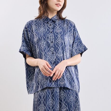 [型番:30-61-04-587]ライン状に配置したタイル柄が目を引く半袖シャツ。ブルーとホワイトの配色で爽やかな印象に仕上げています。軽やかな素材感でさらりと着用でき、程よくゆとりのあるシルエットが抜け感のある着こなしに。パンツにもスカートにも合わせやすく、同柄のボトムと組み合わせたセットアップスタイルも楽しめます。柄のバランスが取りやすく、シンプルなアイテムとも調和しやすいデザインです。