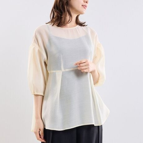 [型番:30-61-02-571]強撚糸で織り上げたポリエステル素材を使用した七分袖プルオーバー。さらりとした肌触りで、透け感が目立ちにくい点も魅力です。肩を落としたゆったりとしたシルエットに、ふくらみのある袖がポイント。ウエスト位置をやや高めで切り替えることで、リラックス感がありながらバランスよく着用できます。ヒップにかかる長めの着丈で、安心感のある着こなしが楽しめます。