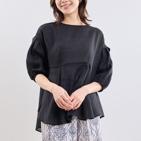 [型番:30-61-02-571]強撚糸で織り上げたポリエステル素材を使用した七分袖プルオーバー。さらりとした肌触りで、透け感が目立ちにくい点も魅力です。肩を落としたゆったりとしたシルエットに、ふくらみのある袖がポイント。ウエスト位置をやや高めで切り替えることで、リラックス感がありながらバランスよく着用できます。ヒップにかかる長めの着丈で、安心感のある着こなしが楽しめます。
