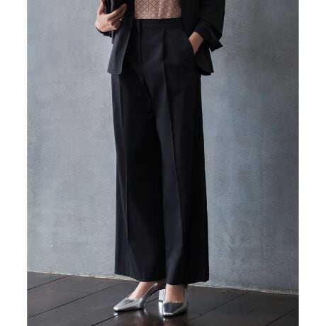■デザインセンタープレス入りでスッキリとした印象のワイドパンツです。ウエストのタックによりヒップ周りに程良いゆとりが生まれ、ボディラインを拾いにくいフォルムに仕上げました。ウエスト部分にゴムを内蔵させたスマートバック仕様で、ラクな履き心地ながらトップスINもきれいに決まります。トップスを選ばず、カジュアルからビジネスまで幅広いシーンで活躍する万能アイテムです。単品使いはもちろん、同シリーズのジャケットとのセットアップでの着用もおすすめです。