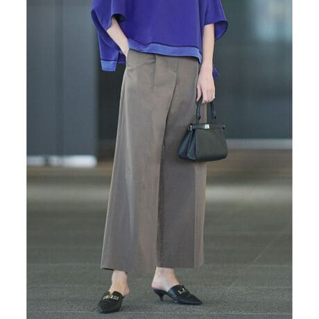 ■デザインセンタープレス入りでスッキリとした印象のワイドパンツです。ウエストのタックによりヒップ周りに程良いゆとりが生まれ、ボディラインを拾いにくいフォルムに仕上げました。ウエスト部分にゴムを内蔵させたスマートバック仕様で、ラクな履き心地ながらトップスINもきれいに決まります。トップスを選ばず、カジュアルからビジネスまで幅広いシーンで活躍する万能アイテムです。単品使いはもちろん、同シリーズのジャケットとのセットアップでの着用もおすすめです。