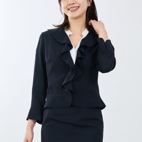 [型番:30-61-22-748]リネンタッチの軽やかな素材を使用した七分袖ジャケット。前立てに施したフリルが印象的で、やわらかな雰囲気の中に程よい華やかさをプラスしています。ウエストラインをきれいに見せるシルエットにこだわり、バランスよく着用できるデザイン。同素材スカートと合わせた統一感のある着こなしはもちろん、シンプルなパンツと合わせたすっきりとしたスタイリングにも取り入れやすい1着です。