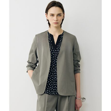 ■デザイン軽さを追求した、スッキリとしたV開きのボタンレスノーカラージャケットです。通常のジャケットよりも肩に重さがかからないよう計算されたフリーアーム設計で、腕の動きを阻害しないストレスフリーな着心地を実現しました。見頃の見返しをなくし、抜け感のある8分袖にするなど、とことん軽さにこだわり、カーディガン感覚で気軽に羽織っていただけるジャケットに仕上げました。単品使いはもちろん、同シリーズのパンツとのセットアップスタイルもおすすめで、オンオフ活躍する一枚です。