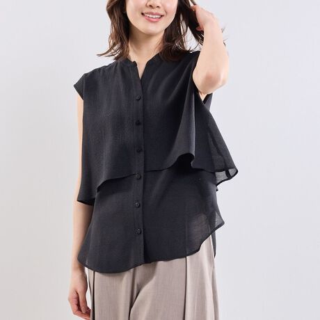 [型番:30-61-04-572]強撚糸で織り上げたポリエステル素材を使用した半袖ブラウス。さらりとした肌触りで、透け感が目立ちにくい点も特徴です。前身頃を二重にすることで動きのある表情が生まれ、軽やかな印象に仕上げています。やや長めのフレンチスリーブとゆとりのあるシルエットで、リラックスして着用できるデザイン。夏のスタイリングに取り入れやすい1枚です。