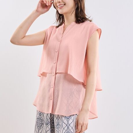 [型番:30-61-04-572]強撚糸で織り上げたポリエステル素材を使用した半袖ブラウス。さらりとした肌触りで、透け感が目立ちにくい点も特徴です。前身頃を二重にすることで動きのある表情が生まれ、軽やかな印象に仕上げています。やや長めのフレンチスリーブとゆとりのあるシルエットで、リラックスして着用できるデザイン。夏のスタイリングに取り入れやすい1枚です。