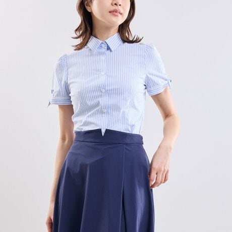 [型番:30-61-04-744]ラメ入りストライプ素材を使用した半袖シャツ。ストレッチ性のある生地で、快適な着心地に仕上げています。やわらかなピンクとブルーの2色展開で、取り入れやすいカラーも魅力。長めの半袖にリボン結びをあしらい、袖口のアクセントに。さらにマイクロレースをさりげなく加えることで、ストライプのきちんと感にやわらかな印象をプラスしています。フレアスカートを合わせて上品にまとめた着こなしもおすすめです。