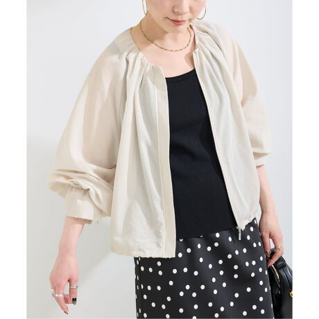 透けすぎないドライタッチなシアーボイル素材を使用し、タック&ギャザーで全体的に丸みのあるボリュームを出したシルエットになります。メタルジップがアクセントになり、カフスと裾がゴムコードで調整できるので、違ったシルエットもお楽しみいただけます。