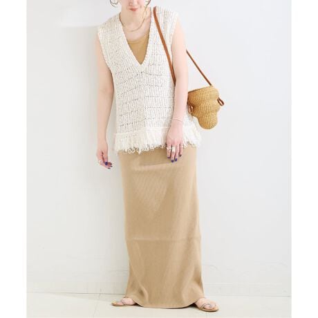 スカートはウエストゴムのストレートシルエット、柔らかなリブなのでヒップ周りも緩めのフィット感になっています。ニットベストは複数の糸を引き揃えてミックス調にし、立体感ある編み地にしました。Vネックで顔周りがスッキリ華やかに見えます。セットスタイリングはもちろん、単品でも活躍しそうなアイテムでこの夏おすすめアイテムです。