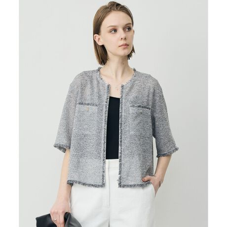 ■デザインフリンジディテールと胸ポケットのメタルボタンがポイントの、今シーズンらしいハーフスリーブジャケットです。立体的なカラミ織り素材の表情を活かしたシンプルなデザインながら、ショート丈にすることで、さまざまなボトムとバランス良く合わせられるよう仕上げています。単品使いはもちろん、同シリーズのワイドパンツやワンピースとのセットアップでの着用もおすすめです。