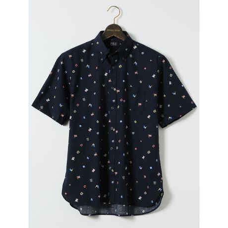 トラッドテイストに仕上げたボタンダウンの半袖シャツです。英国を連想させる、ブリティッシュモチーフの小紋柄です。左胸ポケットにあしらったポニー刺繍がアクセントになっています。