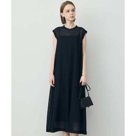 ■デザイン程良いフレア分量がポイントのノースリーブワンピースです。動くたびにひらりと揺れ、女性らしい雰囲気を演出してくれます。襟とアームホール部分にはフリンジディテールを効かせ、より軽やかな印象に仕上げました。素材には適度な透け感がありますが、アンダードレスがセットになっているため、一枚でも安心してお召しいただけます。同シリーズのハーフスリーブジャケットと合わせたセットアップスタイルもおすすめです。
