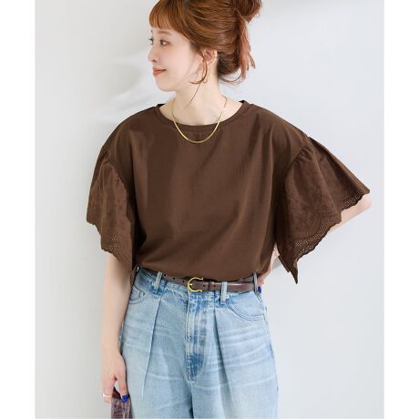 袖部分は布帛のコットンアイレットレースをフリルにしフェミニンさをプラスし、二の腕がしっかり隠れる安心の袖丈にしました。ゆったりとしたシルエットとアームホールにはマチ付きなので動きやすさも充分です。ボディをシンプルに仕上げることで、袖のデザインがより引き立たせています。機能性(UVケア、接触冷感、吸水速乾、遮熱)と華やかさを兼ね備えた春夏に持っておきたい一枚。