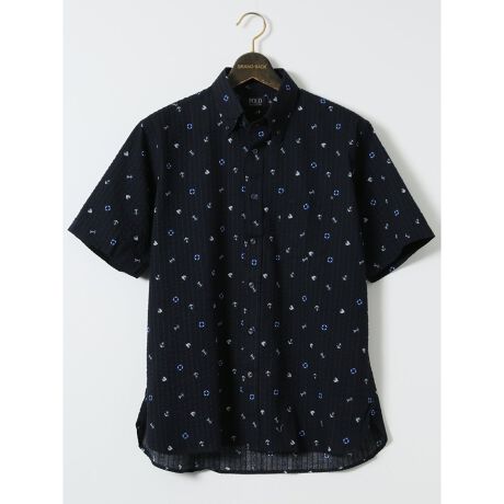トラッドテイストに仕上げたボタンダウンの半袖シャツです。爽やかなマリンモチーフのプリントで清潔感があります。左胸ポケットにあしらったポニー刺繍がアクセントになっています。