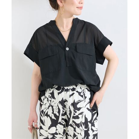 シャリ味のあるシアー素材、少し長めのチュニック丈が新鮮なスタンドスキッパーチュニックシャツ。