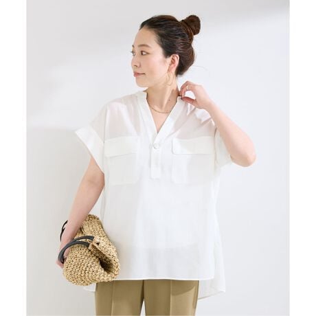 スタンドスキッパー開きで、抜け感のある襟元ややや大きめのメタルボタンがアクセントになります。腕周りはゆとりのあるドルマンスリーブシルエットで、胸元のWポケットがアクセントに。後ヨークのシャーリングギャザーのディテールで後姿もサマになります。手洗い可能でご自宅でのイージーケアができるのも嬉しいポイントです!