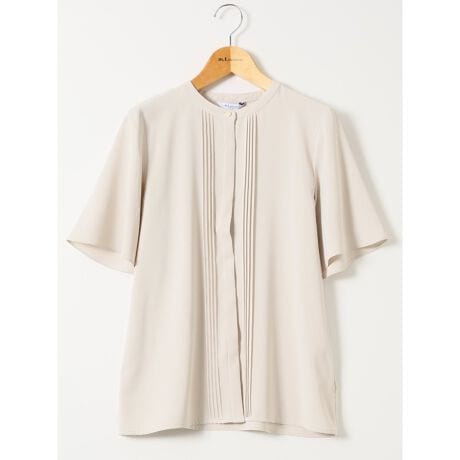 クラシカルな雰囲気に仕上げた、バンドカラーの半袖ブラウスです。フロントのピンタック、ボタンの隠れる比翼仕様、ゴールド調の第一ボタンがポイント。キチンと感のあるクリーンなルックスなのでオンオフ兼用で大活躍してくれます。