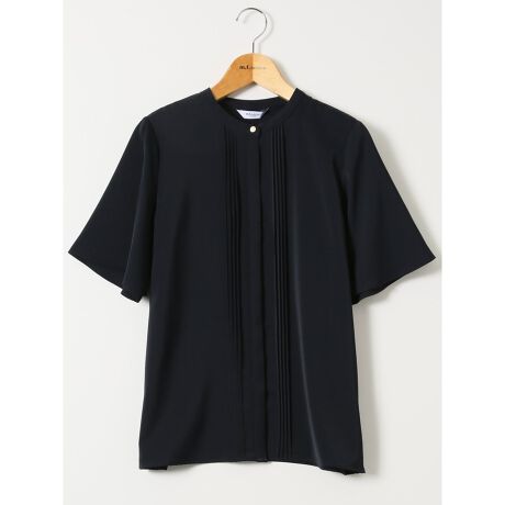 クラシカルな雰囲気に仕上げた、バンドカラーの半袖ブラウスです。フロントのピンタック、ボタンの隠れる比翼仕様、ゴールド調の第一ボタンがポイント。キチンと感のあるクリーンなルックスなのでオンオフ兼用で大活躍してくれます。