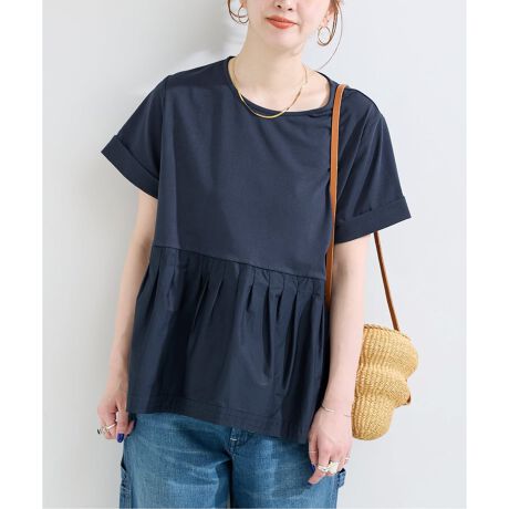 ウエスト下にハリ感のあるTCタイプライター素材に使用しウエストに入れたタックが立体感を出すことで、気になる腰まわりをさりげなくカバーします。身頃のカットソー部分には、これからの季節に嬉しい機能素材(UVケア、接触冷感、吸水速乾、遮熱)を使用しているので、汗ばむ季節も快適な着心地をキープしてくれます。ベーシックなクルーネックに、折り返し仕様の半袖がさりげないアクセントになっていて、デイリーに活躍する一枚です。