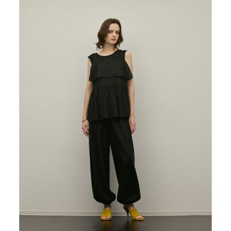 [型番:0326241336]繊細で柔らかなレースを使用したペプラムデザインのトップス。レイヤードのキャミソールはマルチウェイで着用可能。同シリーズでお作りしたレースバルーンパンツ【品番:0323211336】のご用意もございます。※こちらのモデル着用画像はサンプル品を撮影しております。実際の商品と仕様、加工、サイズが若干異なる場合がございます。予めご了承くださいませ。