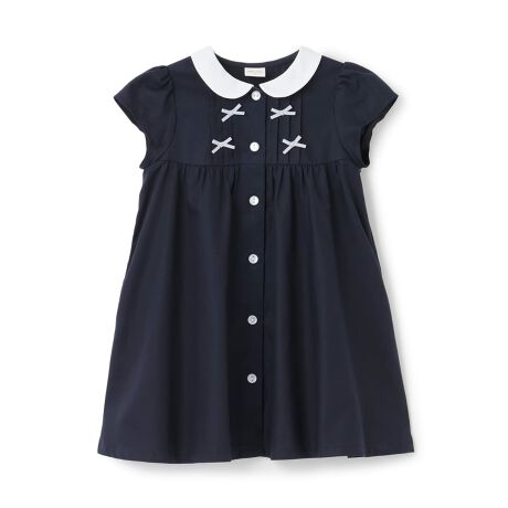 胸元のタックにちびリボンでアクセントを添えたワンピースです。きちんと感のある衿つきデザインで、大人っぽい雰囲気がただよいます。ボタンの前開き仕様なのでお着替えもラクラク。おめかししたいフォーマルシーンの装いにぴったりなアイテムです。内側にお名前を記入できるタグつき。