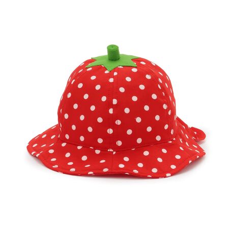 いちごとレモンをモチーフにした可愛らしいフルーツハットです。紫外線対策に役立つUVカット機能つきの素材を使用しています。頭回りは後ろの紐でサイズを調節可能。日よけ布やあごゴムを備えているのもうれしいポイントです。暑い時期のお出かけやお外遊びに重宝します。