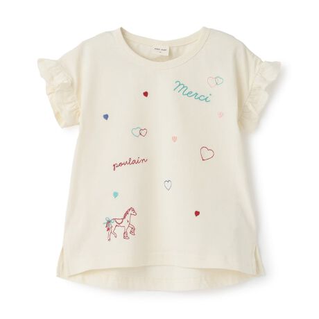 袖口にフリルをあしらった女の子らしいTシャツです。お花やハート、アニマルなどをカラフルに刺しゅうしています。それぞれ異なるデザインなので、色違いで持っておくのもおすすめ。どんなボトムスとも相性が良く、毎日の着回しに重宝します。内側にお名前を記入できるタグつき。
