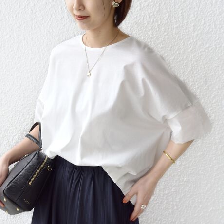 裾にはゴムを入れており、ボトムにインしなくてもそのままさらっと着るだけでこなれ感のある見え方に。