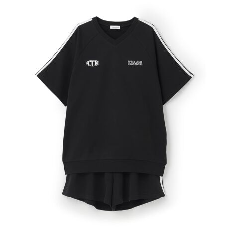 綿100%素材によるやさしい肌触りがうれしいセットアップです。ゆるっとしたシルエットなので着心地も快適! トップスは首元がスッキリ見えするVネックデザインです。シンプルな刺しゅうとバックプリントでおしゃれに仕上げました。ショートパンツはポケット&ウエストアジャスターつきで、デイリーに着回すことも可能。通学や宿泊学習はもちろん、おうちでのリラックスタイムにも重宝します。【おすすめの着用時期は春夏シーズン】
