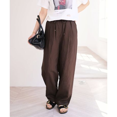 麻レーヨンにポリエステルをブレンドした、軽やかな平織素材のパンツ。