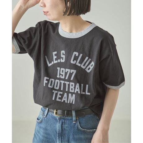 胸元に配したロゴが、シンプルな中にさりげない存在感を添えるTシャツは今年大注目のリンガーTシャツに。