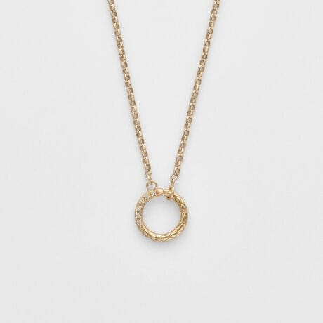 引き輪そのものにデザイン性と開閉機能を持たせた、どの角度から見ても美しいネックレスです。トップのサークルにはダイヤモンドをあしらい、アンティークの風合いを楽しめる彫模様を施しました。シンプルな佇まいの中に、細部までこだわりを込めたデザインです。>1)チェーン本体にネックレスチャームを通す2)サークルの金具部分にネックレスチャームを通すチャームの付け方を変えることで、新しいバランスのコーディネートが可能です。お手持ちのネックレスチャームとも合わせやすく、重ね付けのスタイリングをより洗練された印象に仕上げてくれます。また、サークルモチーフを背面にすれば、シンプルなチェーンとしてもお使いいただけます。(10203115005-08-999)よりも小ぶりなチャームとも好相性な、程よい太さのチェーンに仕上げています。※天然石や天然素材を使用しているものは、サイズ・色味・風合いの違いや、若干の傷、内包物の有無などに個体差があります。予めご了承ください。