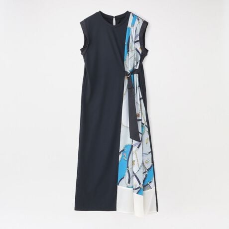 ドレスの左サイドには、LOVELESSオリジナルのスカーフ柄をプリントしたオリジナルのテキスタイルを使用。