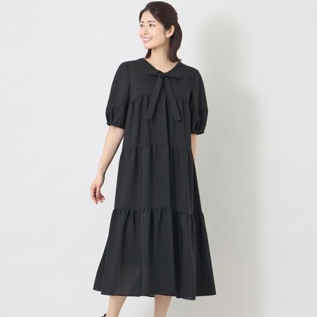 襟元は共布リボン付きの続き襟デザインで、胸下切替のティアードシルエットがエレガントな一枚。体型をさりげなくカバーしながら、エレガントで着やすいデザインに仕上げました。袖はやや長めの半袖丈で、気になる二の腕も自然にカバーしてくれます。