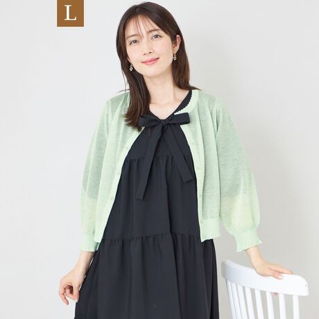 ギャザー入りのふんわりスリーブが華やかなショート丈カーディガン。