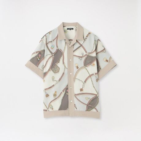 オリジナルで作成したスカーフ柄をブロッキングしたオープンカラーハーフスリーブシャツ