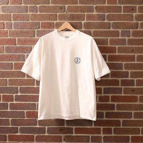 フロント左胸にワンポイントでヴィンテージ調の錨マーク、バックには手描きで描き下ろした帆船を配置。