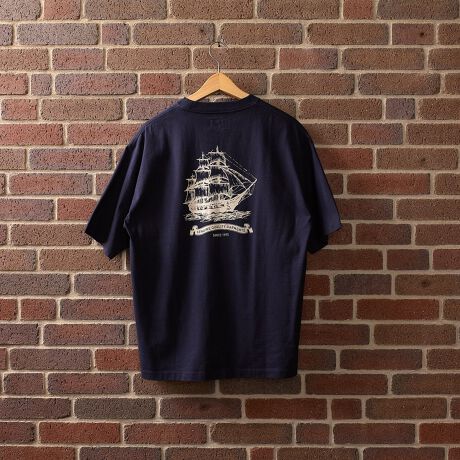 フロント左胸にワンポイントでヴィンテージ調の錨マーク、バックには手描きで描き下ろした帆船を配置。