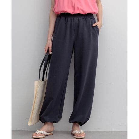 ■デザイン ・トレンド感のあるスウェットパンツ。太すぎない絶妙なセミワイドシルエットで、カジュアルにもきれいめスタイルにもマッチします。・ウエストは総ゴム仕様で快適な穿き心地。内側のドローストリング(引きひも)で、お好みのサイズ感に調整が可能です。 ・裾にもドロストゴムが入っており、シルエットの変化を楽しめます。 ・前両脇と後ろに便利なポケットが付いており、デイリー使いに嬉しい実用性も兼ね備えています。 ・ブラウスやパンプスと合わせたきれいめミックスコーデや、同素材のペプラムトップス(4月発売開始予定)と合わせたリラクシーなセットアップスタイルもおすすめです。