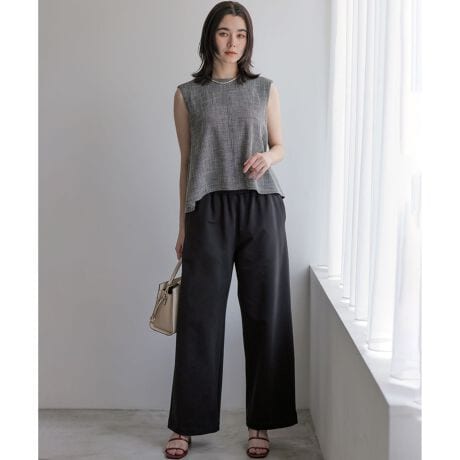 ■デザイン ・トレンド感のあるスウェットパンツ。太すぎない絶妙なセミワイドシルエットで、カジュアルにもきれいめスタイルにもマッチします。・ウエストは総ゴム仕様で快適な穿き心地。内側のドローストリング(引きひも)で、お好みのサイズ感に調整が可能です。 ・裾にもドロストゴムが入っており、シルエットの変化を楽しめます。 ・前両脇と後ろに便利なポケットが付いており、デイリー使いに嬉しい実用性も兼ね備えています。 ・ブラウスやパンプスと合わせたきれいめミックスコーデや、同素材のペプラムトップス(4月発売開始予定)と合わせたリラクシーなセットアップスタイルもおすすめです。