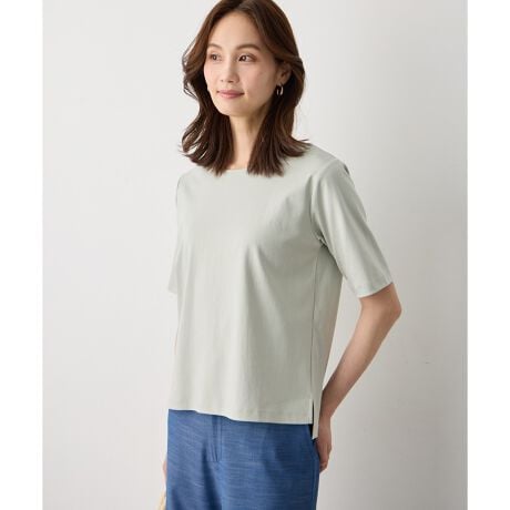 [型番:351689]顔まわりを明るく見せるすごツヤTなめらかなツヤ感が特徴のスゴつや素材を使用した半袖Tシャツ。ベーシックカラーに加え、顔まわりが華やぐ新色も揃い、気分やシーンに合わせて選べる一枚です。アクセサリーをプラスすれば、シンプルながらも印象的なスタイリングに仕上がります。