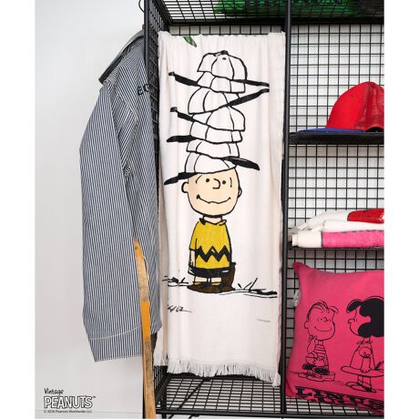 ヴィンテージタオルをイメージし、PEANUTSの仲間たちとセリフやカラーリング、フリンジ仕様など、細部まで拘りました。