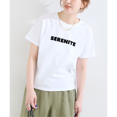 表面感が特徴的なフロッキープリントのミニマムなロゴが大人に着られるTシャツ。やや短めの丈感でコンパクトにしていて、キャミワンピースなどとレイヤードでロゴが見えるような配置にしています。