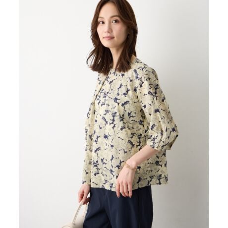 [型番:353845]やさしく映えるリバティシャツニュアンスカラーの柔らかなプリントが印象的なノーカラーシャツ。ふんわりとしたシルエットで、やさしい雰囲気をまといながらリラックスして着られる一枚です。シンプルなボトムと合わせるだけで、自然と雰囲気のあるスタイリングに仕上がります。