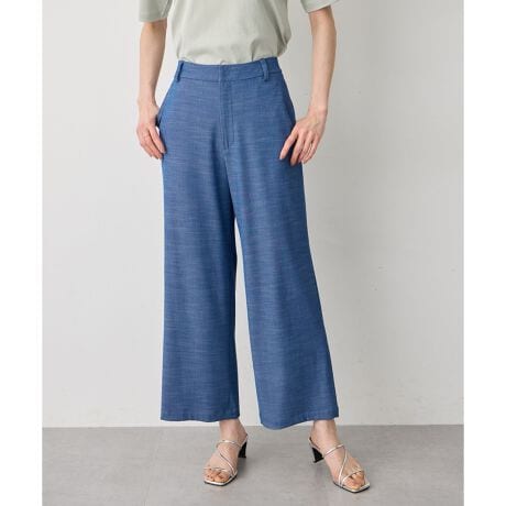 [型番:354147]軽やかに穿けるデニム風ワイドデニム見えする表情でありながら、合繊素材ならではの落ち感で上品に仕上げたワイドパンツ。ほどよい広がりのシルエットでリラックス感がありつつ、きれいめな印象で着こなせる一本です。カジュアルになりすぎないデニムスタイルが楽しめます。
