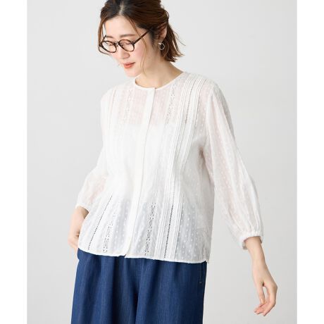 [型番:523299]涼やかに映えるレースブラウスピンタックとレースをあしらい、軽やかで華やかな印象に仕上げた一枚。通気性のよいコットンドビー素材で、暑い季節もさらっと快適に着られます。前を開けて羽織りとして取り入れたり、インナーにタンクトップを合わせて抜け感のある着こなしもおすすめです。