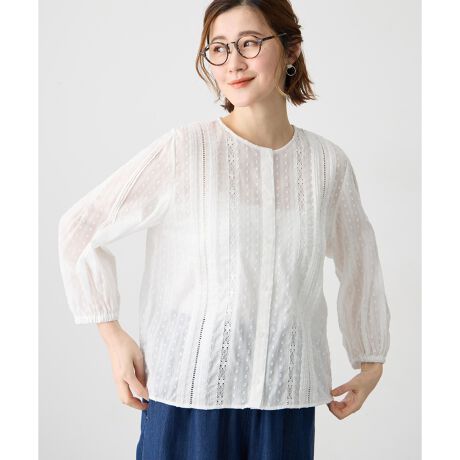 [型番:523299]涼やかに映えるレースブラウスピンタックとレースをあしらい、軽やかで華やかな印象に仕上げた一枚。通気性のよいコットンドビー素材で、暑い季節もさらっと快適に着られます。前を開けて羽織りとして取り入れたり、インナーにタンクトップを合わせて抜け感のある着こなしもおすすめです。
