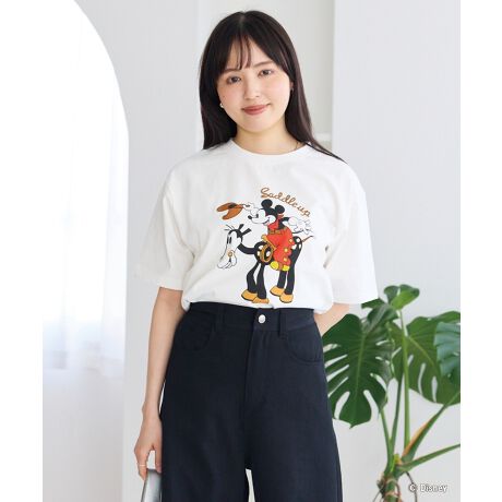 レトロタッチのミッキーデザインがこなれた雰囲気を演出し、フロントの遊び心あるグラフィックがコーデの主役に。