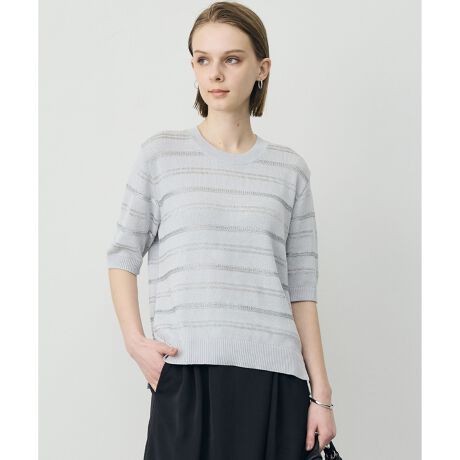 ■デザインラメ糸をボーダー状に編み込んだ、華やかで上品な印象のニットプルオーバーです。ソフトタッチに仕上げた着心地の良さもポイントです。5分袖デザインで、一枚着としてはもちろん、ジャケットのインナーとしてもおすすめです。