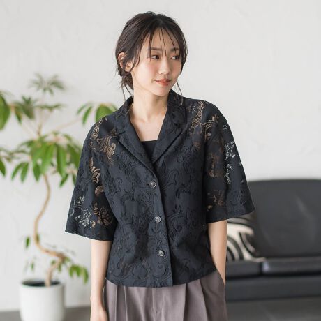 華やかなペイズリーコットンレースが目を惹くオープンカラーシャツです。ボクシーなシルエットでコンパクトな丈感なので、ボリュームのあるパンツやスカートなどとも相性抜群です。フロントは閉じてもオープンで羽織としても着用できるため、コーディネートの幅も広がります。ワンピースの上にさらっと羽織るスタイルもおすすめです。綿の程よいハリ感を持った肌触りの良い生地を使用しており、レースの程よい透け感が涼やかな印象を与えてくれるアイテムです。