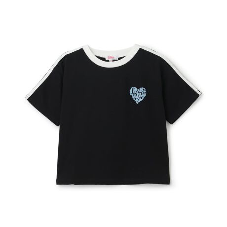 ハート型になったロゴグラフィックが目を引く半袖Tシャツです。少し立体的なジェルプリントはラメ入りで、キラッと光ります。